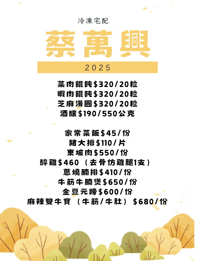 隆重鉅獻「蔡萬興2025冷凍宅配系列」,我們將老師傅的匠心與歲月的火候,以最新鮮的狀態急速冷凍,完美封存。讓您無須排隊等候,在家就能輕鬆復熱,隨時享受一桌道地的餐廳級盛宴。